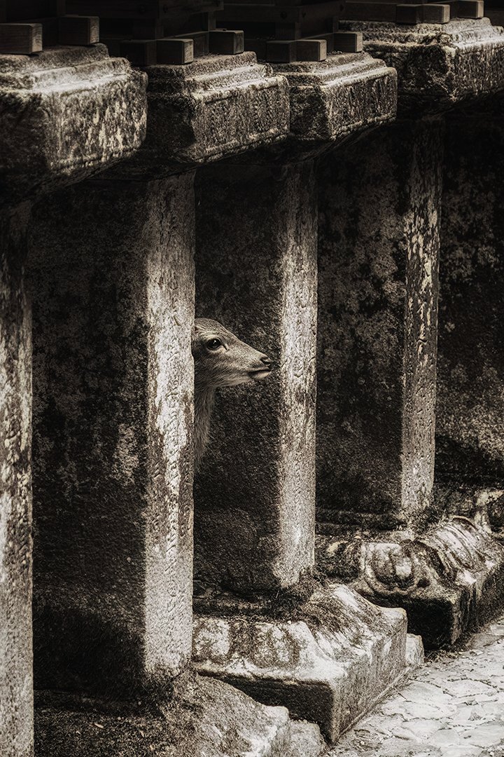 Nara Park - Fujifilm X-T5, 1/125 @ f/7.1, ISO 1000, 83mm. - At this park in Japan the deer are considered sacred. They are protected by law. You can even feed them! Needless to say, they are everywhere, offering unlimited photo opportunities. I added texture and grain to this monotone to bring out the gritty look of the stonework and lightened the center around the deer’s head.